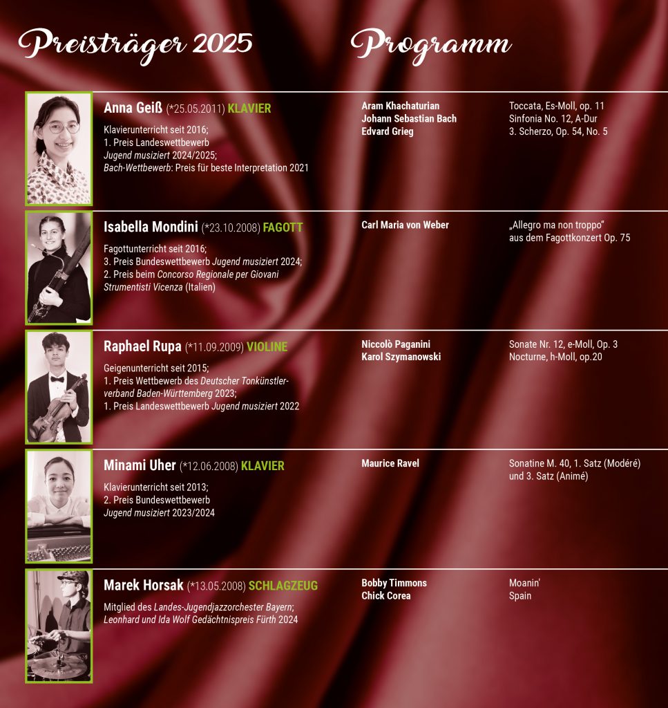 Auch dieses Mal werden wieder vielversprechende junge Talente geehrt, die ihr Talent bereits unter Beweis gestellt haben. Mit 18 Bewerberinnen und Bewerbern in zehn musikalischen Sparten sowie Ballett, hatten die Jurorinnen und Juroren unter der Leitung von Silke Herold-Mändl eine schwierige Auswahl zu treffen. Das Vorspielen fand im Juli 2025 im Schliemann-Gymnasium und im Stadttheater statt.